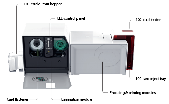 پرینتر Primacy Lamination (لمینیت) تا ۲۱۵ کارت تمامرنگ یک رو در ساعت تولید میکند. در جلوی پرینتر، یک مخزن ورودی ۱۰۰ کارته در بالا و یک سینی رد ۱۰۰ کارته در پایین وجود دارد که فرآیند تغذیه و جمعآوری کارت را بدون دردسر میکند. صافکننده داخلی از خم شدن کارتها جلوگیری میکند و صدور کارتهایی با ظاهر حرفهای را تضمین میکند.